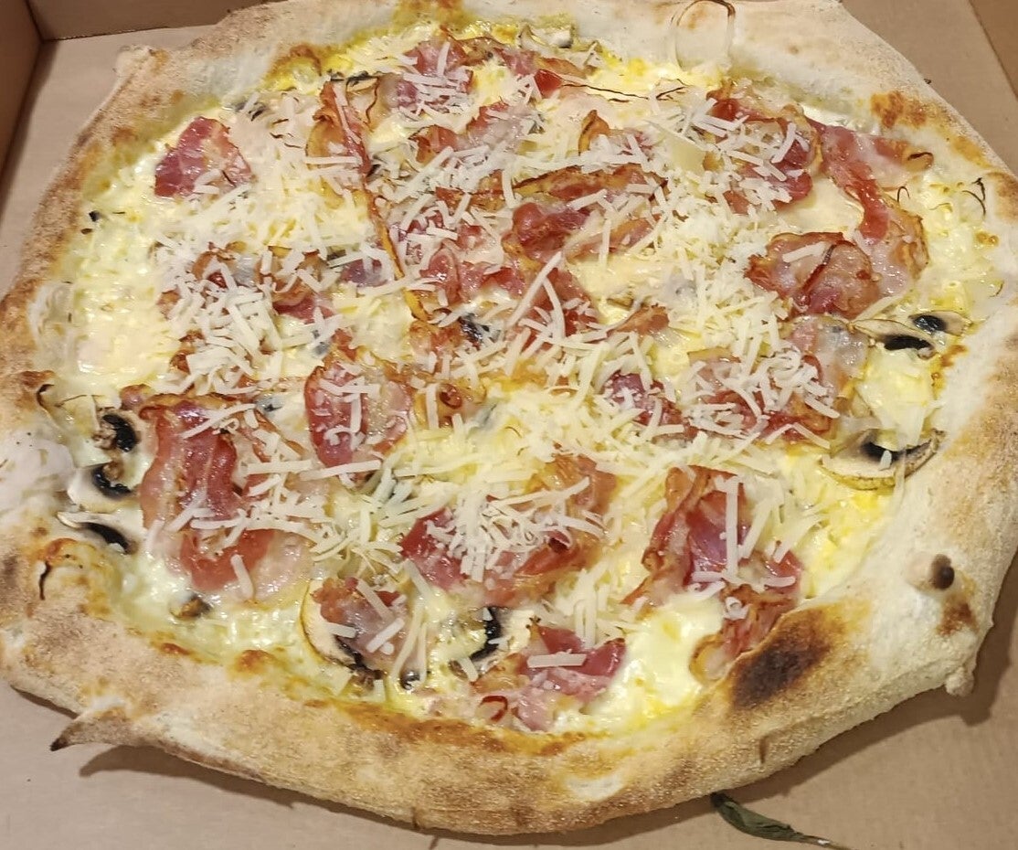 Mozzarella, lonchas tiernas de jamón York, champiñones frescos, huevo batido y escamas de Parmesano