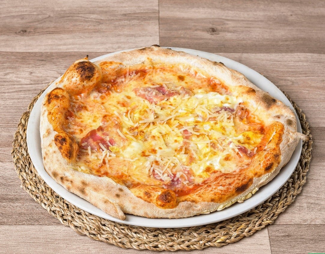 Salsa de tomate, Mozzarella Fiordilatte, pancetta italiana, huevo fresco y Parmesano rallado