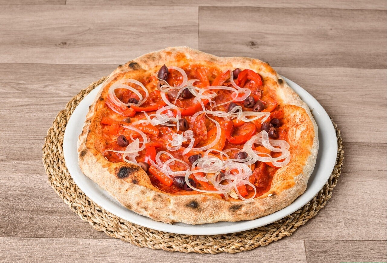 Base cremosa de tomate, Mozzarella Fiordilatte, chorizo italiano especiado, pimiento, cebolla y aceitunas negras